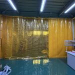 芯材入りの間仕切りカーテンを工場内に施工いたしました。取手付きなので、簡単にカーテンの開け閉めが出来ます。