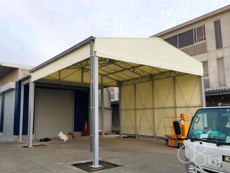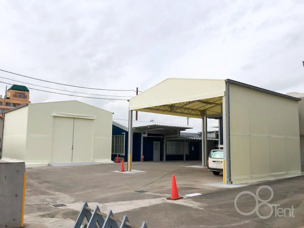 テント倉庫は、柱のない大空間を作り、補完物の配置や移動などの自由度の高い業務スペースを実現するテント製の倉庫です。出入口も大きくとることができ、重機や運搬時の出入りもスムーズです。