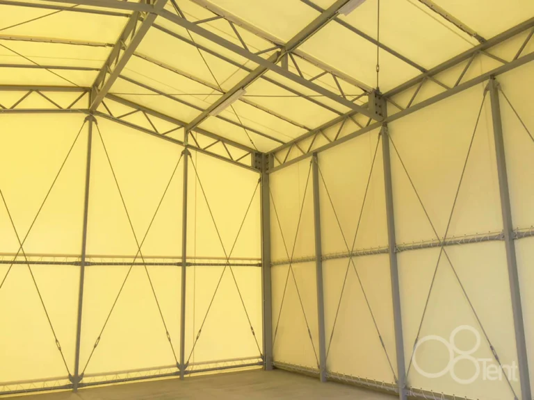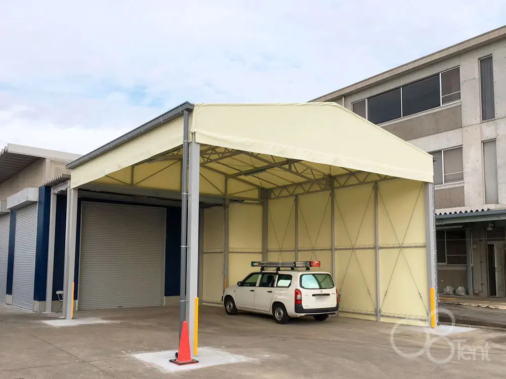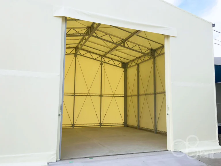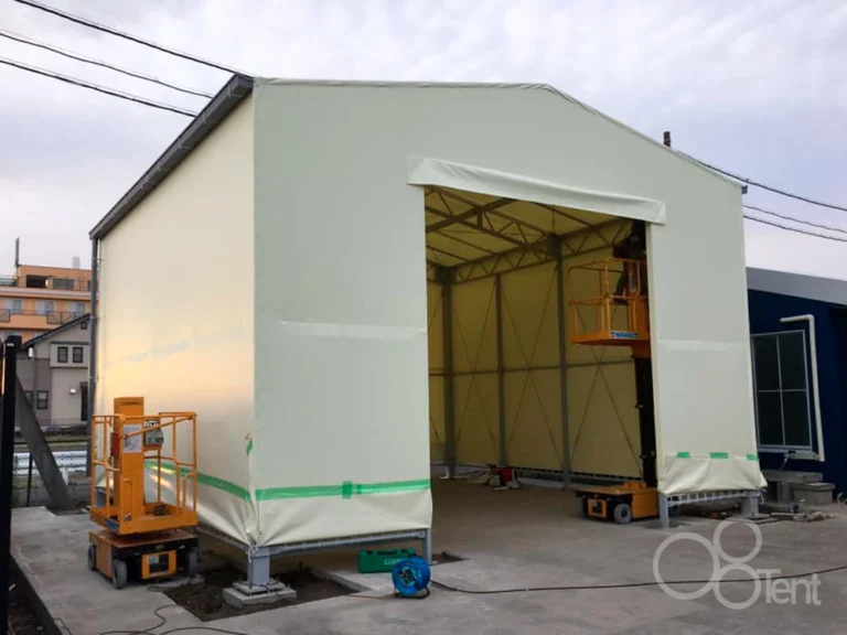 完全に壁と扉で囲われたテント倉庫です。雨風や直射日光、埃などから大切な研究機材や資材をしっかりと守ります。大型の観音開き扉を採用しているため、大きな荷物の出し入れもスムーズに行えます。