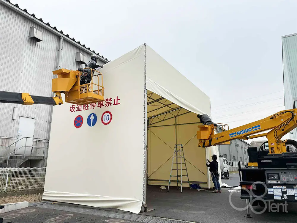 経年により汚れたり傷んだりしたテント倉庫のシート張替え工事を行いました。今回は単にシートを新しくするだけでなく、お客様のご要望に応じて、テントの壁面に交通標識のサイン表示を施しています。