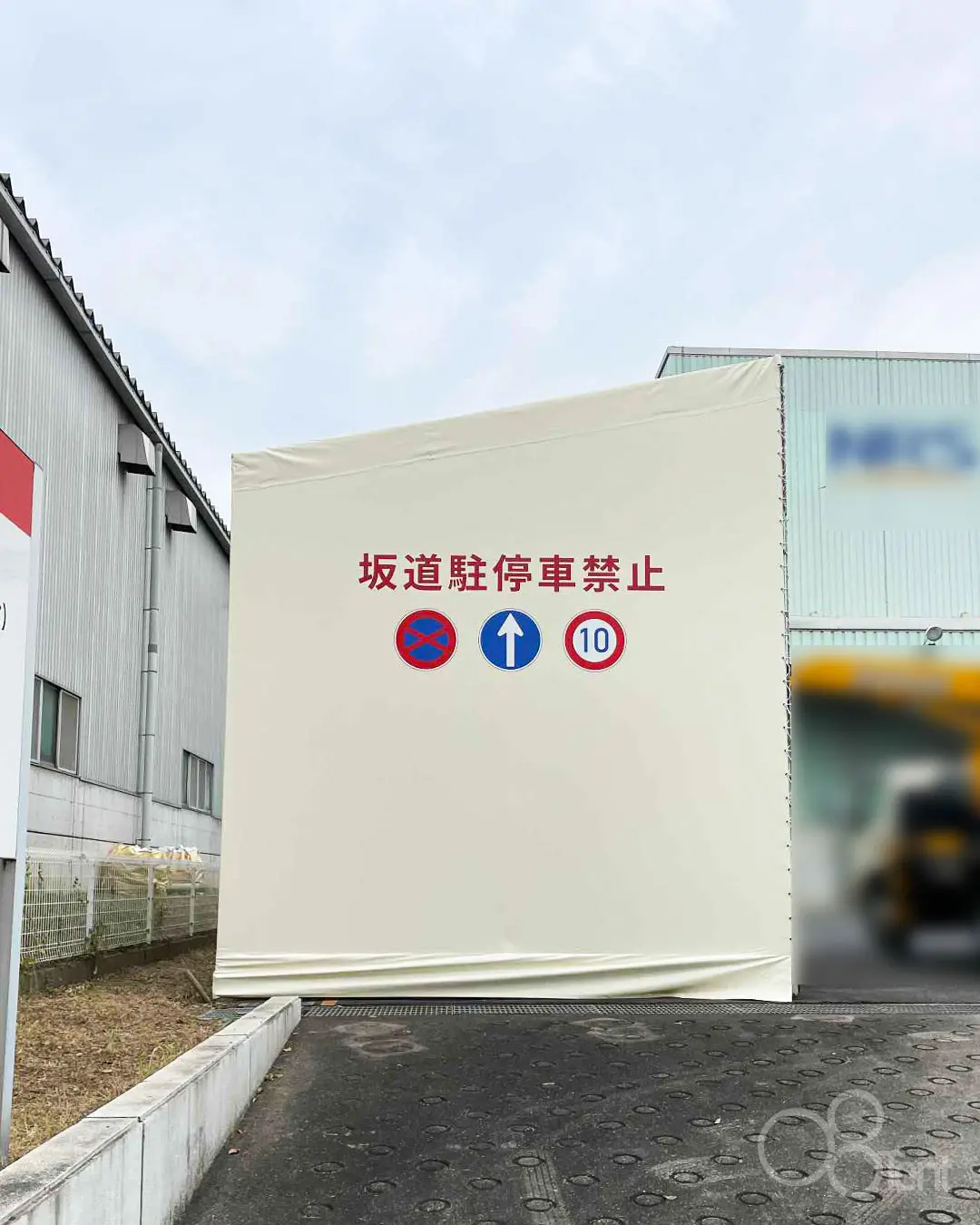 「坂道駐停車禁止」の大きな文字と、「駐停車禁止」「直進」「速度制限10km」の標識を、視認性の高いカッティングシートで加工・貼り付けました。これにより、工場や倉庫の敷地内における車両の安全な通行を促し、事故防止に貢献します。