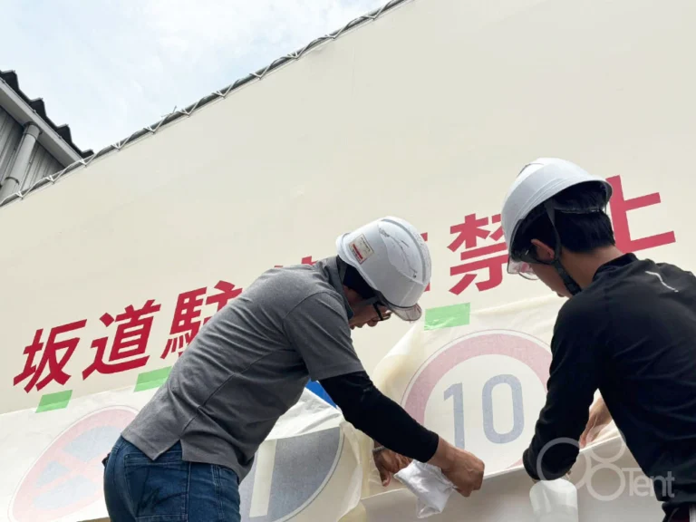 シートを張り替えることでテント本来の機能性や美観を取り戻すと同時に、壁面を効果的な案内板・注意喚起のサインとして活用できます。交通標識はもちろん、企業ロゴや任意のテキストなど、様々なデザインに対応可能です。