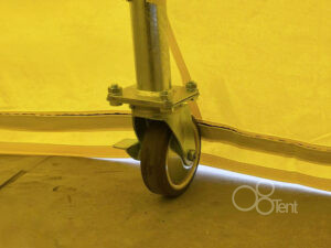 キャスター式R曲げジャバラ通路テントとなります。曲線の通路の雨よけになります。