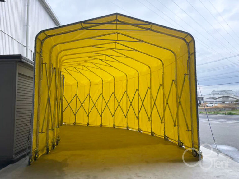 ジャバラテントとは、ジャバラ状の伸縮可能な支柱にテントシートを取り付けた、可動式のテントです。サイドがジャバラ状になっているため、必要ない時には折り畳むことが可能です。地面にレールを設置しキャスターを取り付けてあるため、大型のものでも手動で開閉することが可能です。
